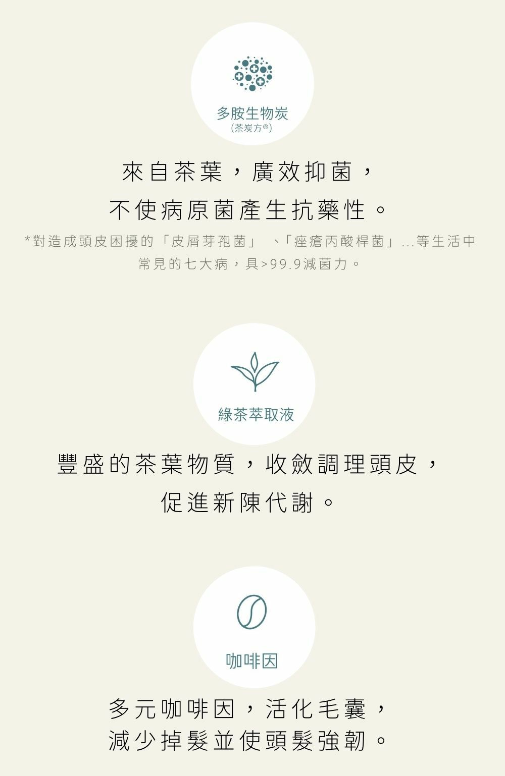 ★ 茶炭方® >99.9%皮屑芽孢菌減菌力,物理溫和抑屑,不產生抗藥性。